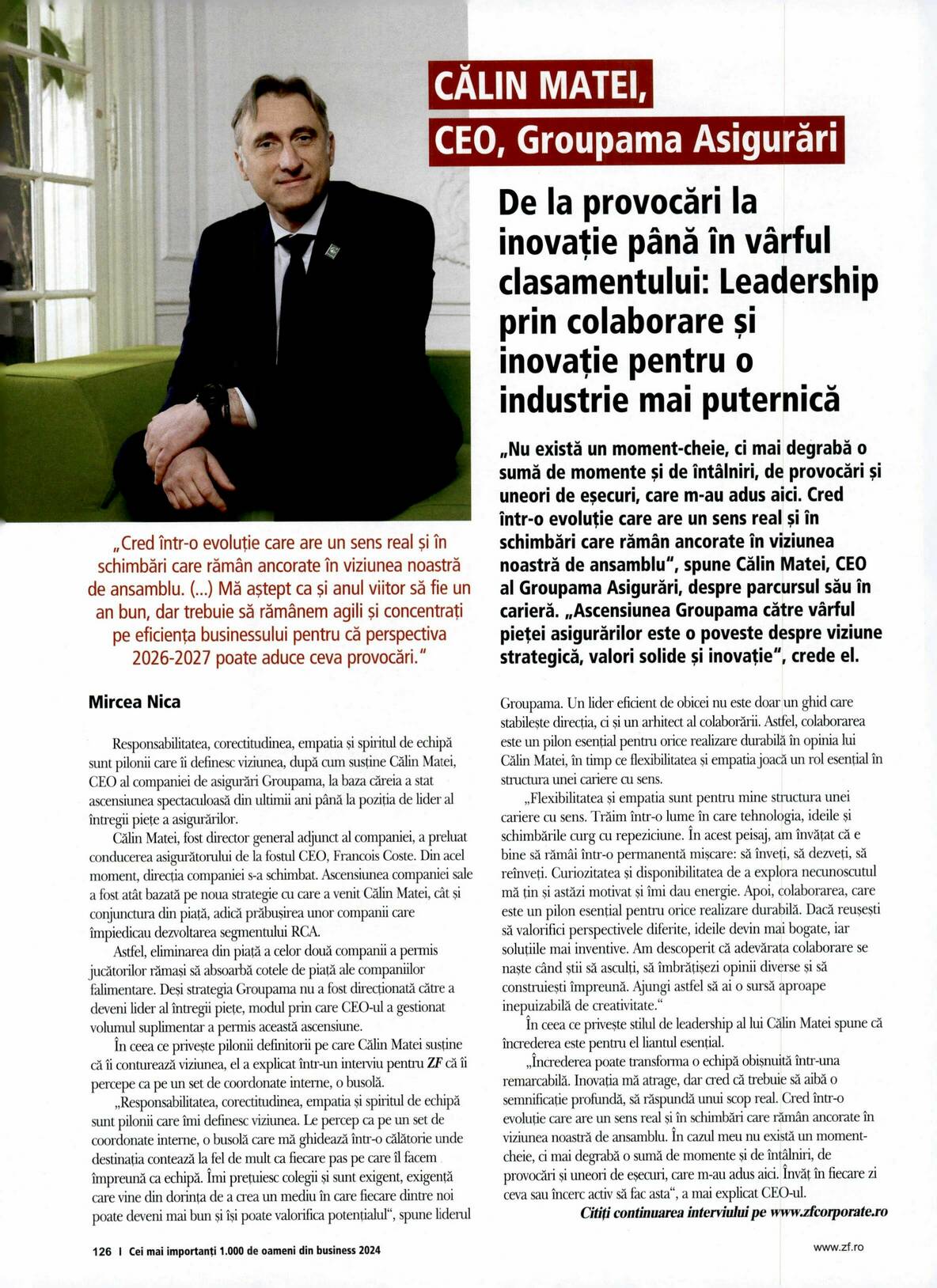 'Responsabilitatea, corectitudinea, empatia şi spiritul de echipă sunt pilonii care îmi definesc viziunea. Le percep ca pe un set de coordonate interne, o busolă care mă ghidează într-o călătorie unde destinaţia contează la fel de mult ca fiecare pas pe care îl facem împreună ca echipă. îmi preţuiesc colegii şi sunt exigent, exigenţă care vine din dorinţa de a crea un mediu în care fiecare dintre noi poate deveni mai bun şi îşi poate valorifica potenţialul', spune liderul CĂLIN MATEI, CEO, Groupama Asigurări De la provocări la inovaţie până în vârful clasamentului: Leadership prin colaborare şi inovaţie pentru o industrie mai puternică 'Nu există un moment-cheie, ci mai degrabă o sumă de momente şi de întâlniri, de provocări şi uneori de eşecuri, care m-au adus aici. Cred într-o evoluţie care are un sens real şi în schimbări care rămân ancorate în viziunea noastră de ansamblu', spune Călin Matei, CEO al Groupama Asigurări, despre parcursul său în carieră. 'Ascensiunea Groupama către vârful pieţei asigurărilor este o poveste despre viziune strategică, valori solide şi inovaţie', crede el.